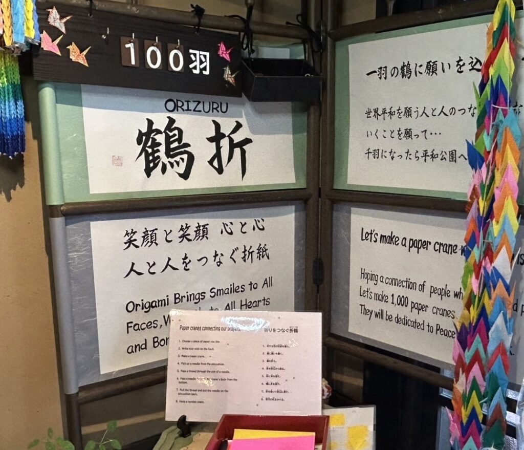 千羽鶴を折るコーナーでは,たまたま隣に座った初めて出会う人とでも,平和を願い鶴を折るという同じ事をすることで,自然とコミュニケーションがとれ,いつの間にか笑顔になり,言葉は通じなくても心と心がつながっていきます。